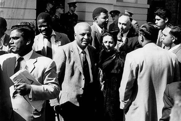 N.T. Naicker (foreground left) exiting South African Treason Trials with Monty Naicker (center), Nelson Mandela (behind woman on right) and Yusuf Dadoo (right of Mandela).